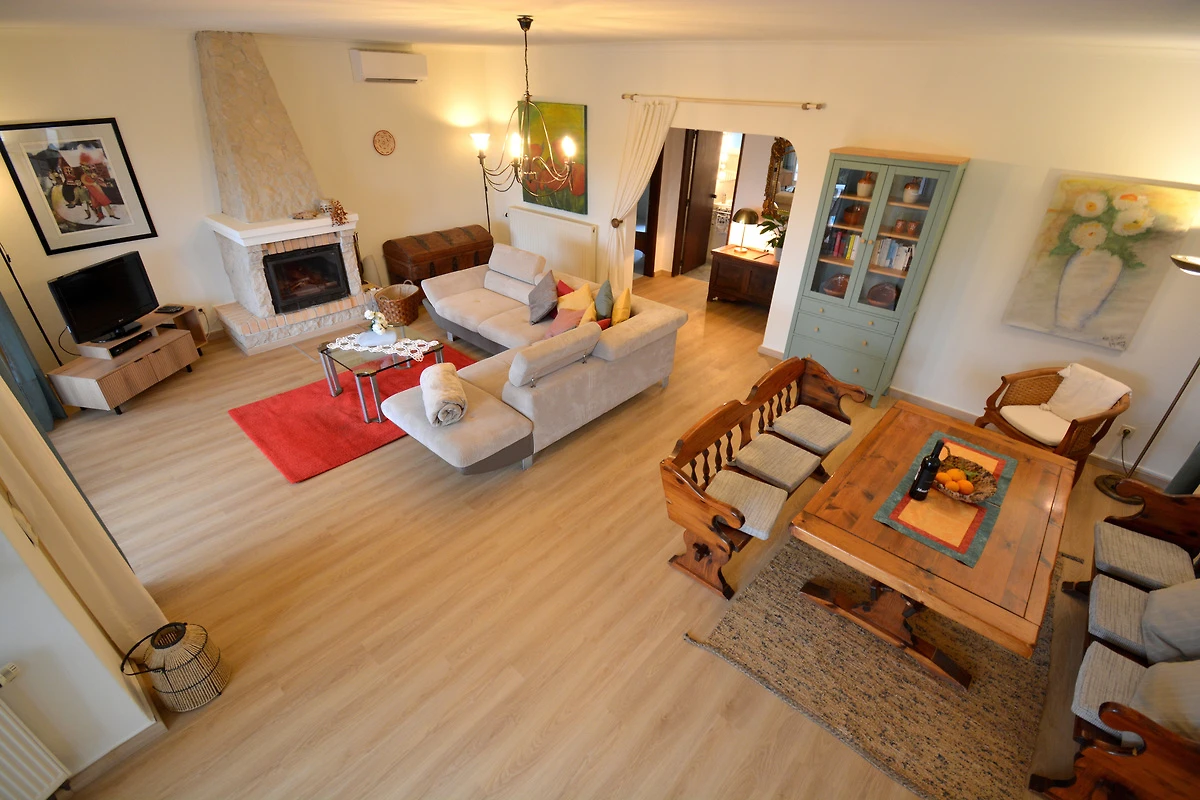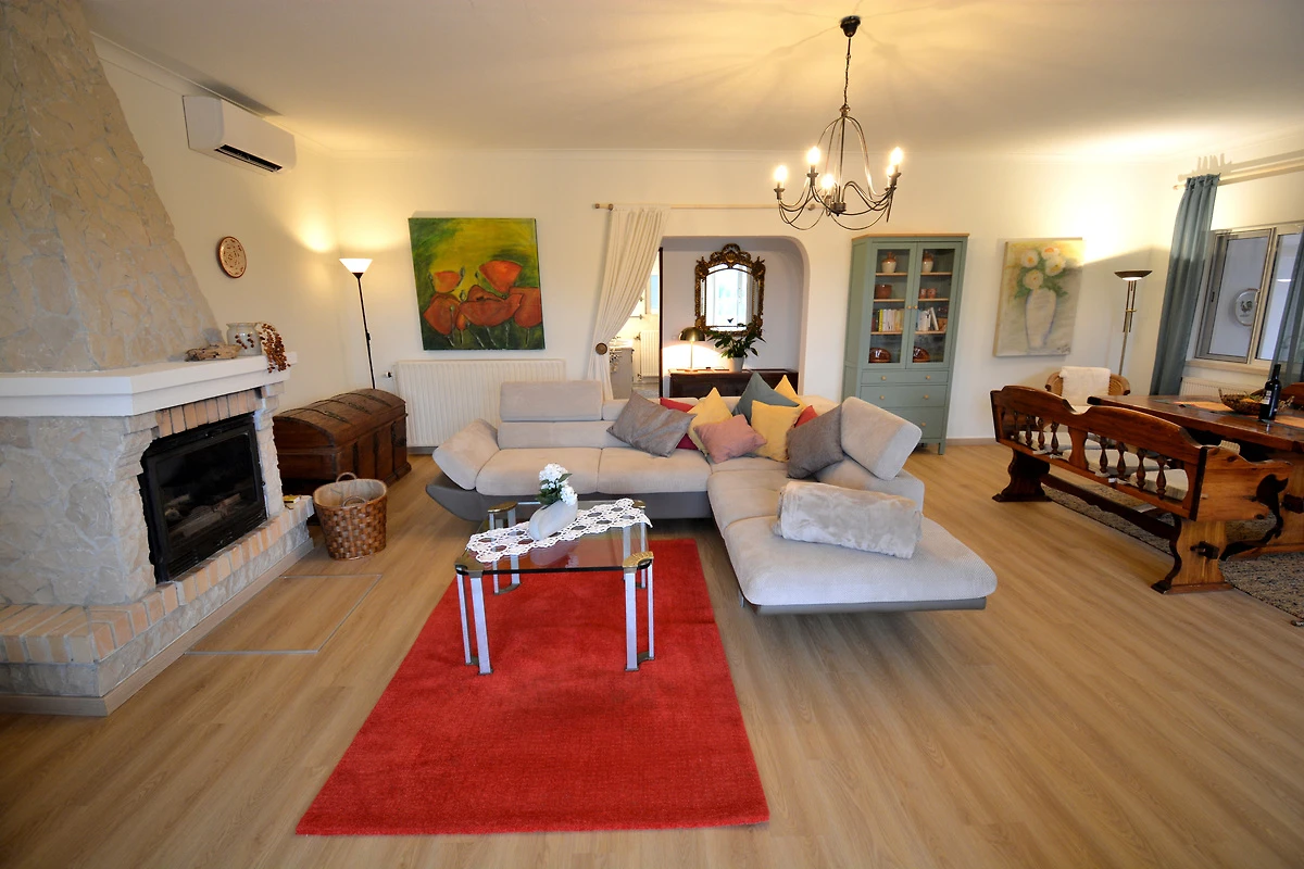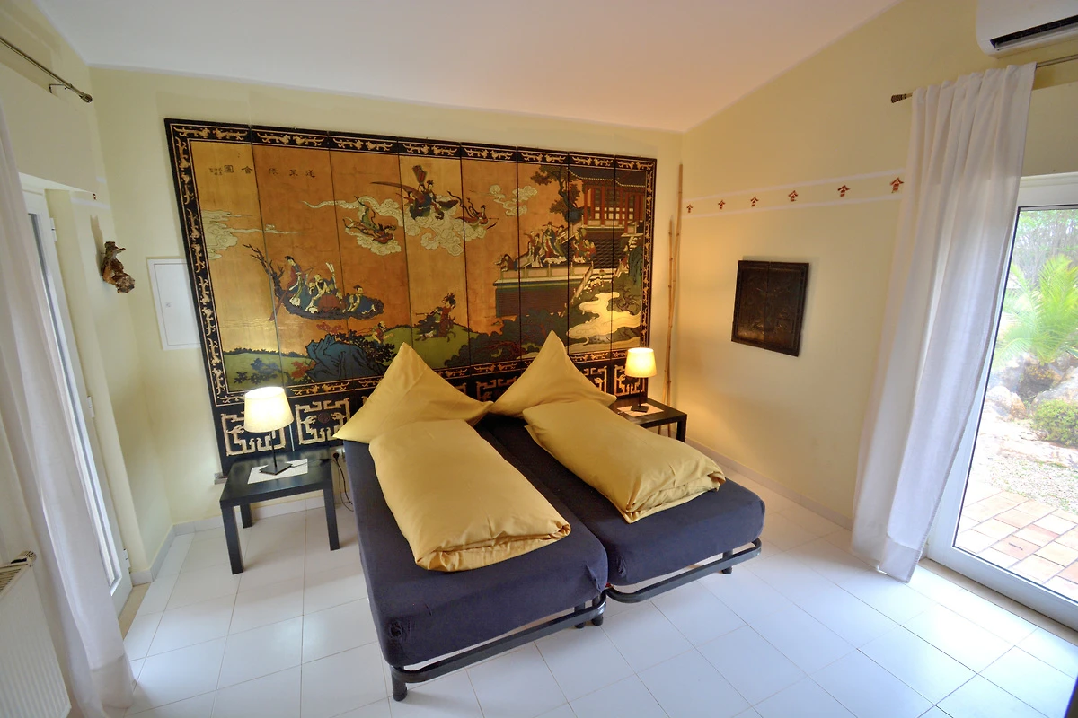 Hacia la zona de la piscina, justo delante de la gran ventana del salón, hay una terraza cubierta con vistas al pequeño jardín de piedras vecino, y bajo el gran algarrobo se puede disfrutar especialmente del romanticismo de la semisombra. Todo esto está a disposición exclusiva de los huéspedes de la Villa Diana. Aproximadamente 30 metros detrás de la casa de vacaciones, separada por un alto seto de adelfas, vive temporalmente la arrendadora, quien, sin embargo, respeta la privacidad de los visitantes.