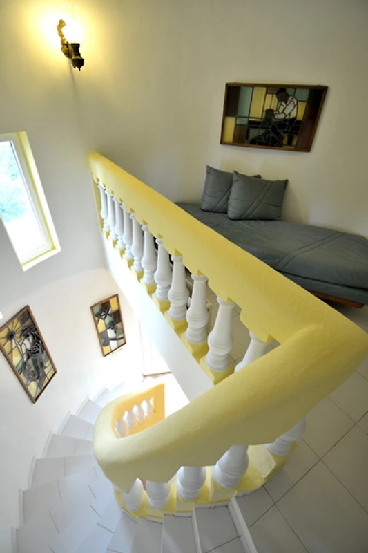 A través de la elegante escalera de caracol se llega a la pequeña habitación de la torre, donde hay otra posibilidad de dormir para una persona (bajo petición). Al lado se encuentra la gran terraza en la azotea con tumbonas, mesa y sillas.