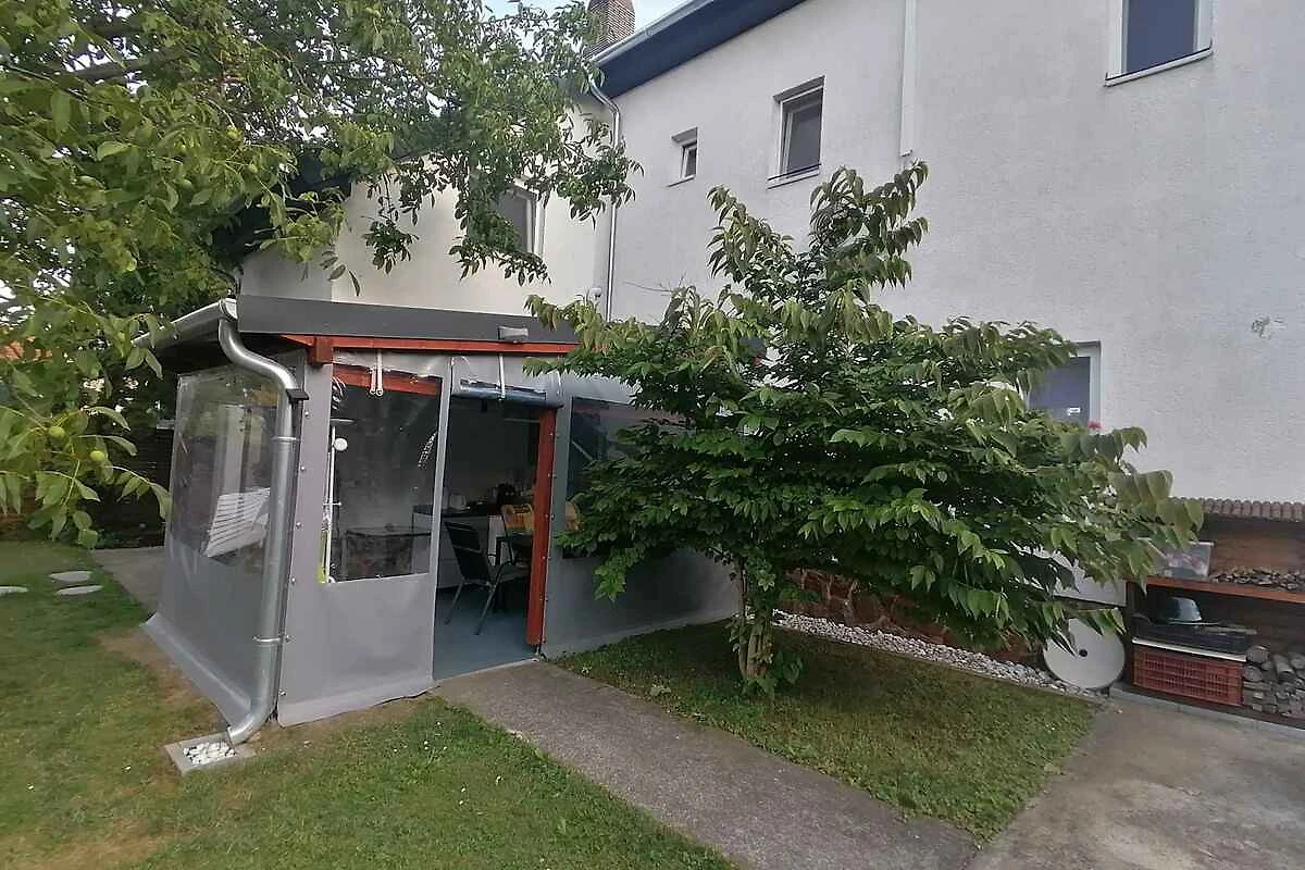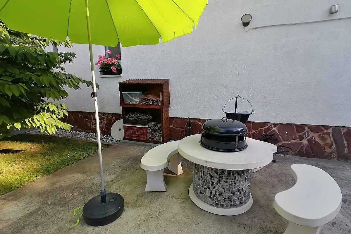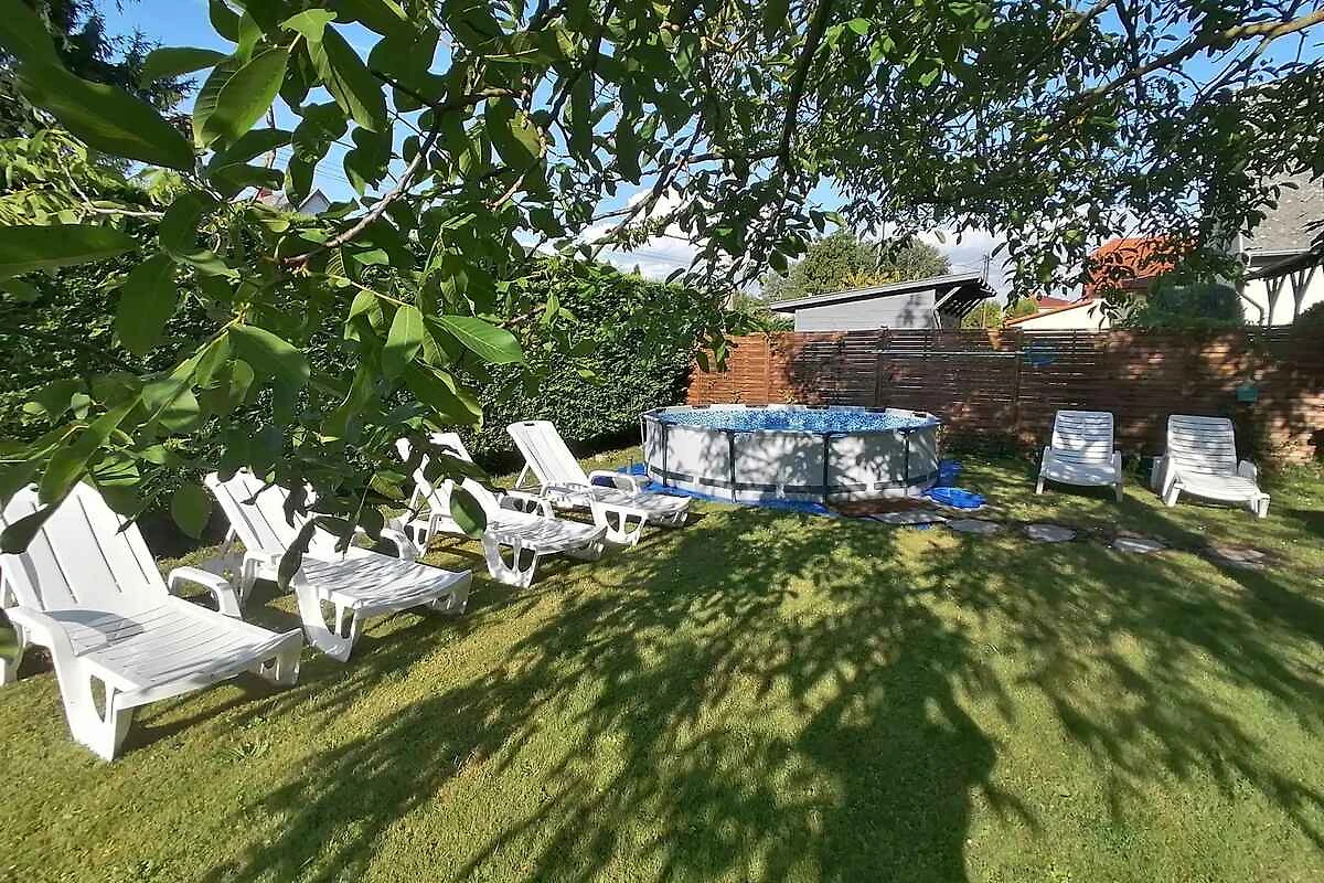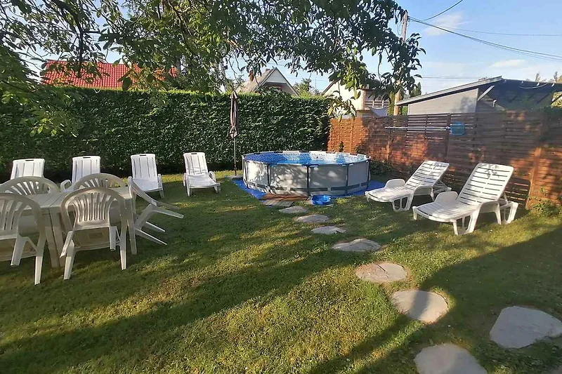 El apartamento vacacional está rodeada por un cerrado terreno de jardín o (400 m²) con prado, árboles, flores y arbustos. El terreno está rodeado de una valla y un seto. El propietario vive temporalmente en la casa o (con entrada privada). Esta casa tiene 2 apartamentos. Este apartamento tiene una entrada independiente en el primer piso y un jardín privado. Para uso privado a su disposición: césped, sombrilla, tumbona, muebles de jardín, columpio de jardín, barbacoa, zona de hogueras y patio. Piscina exterior para el uso común (diámetro 3,2 m, 1 m de profundidad). La instalación de la piscina esta operativa desde principios de junio hasta finales de agosto. Placa con agua fría y caliente. Parrilla para 6 personas.