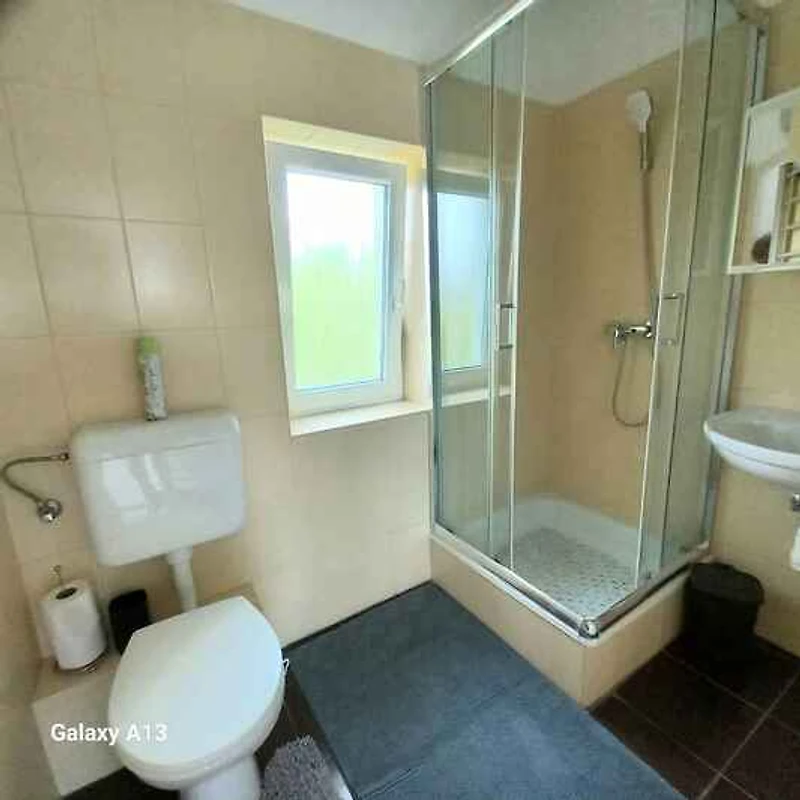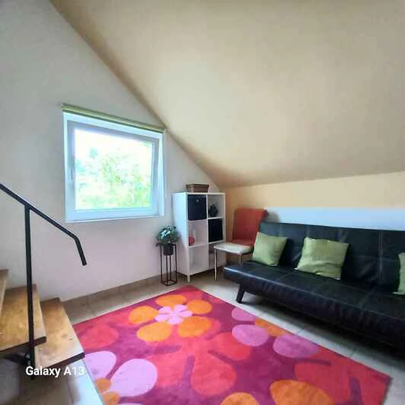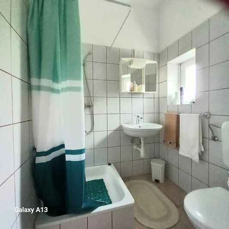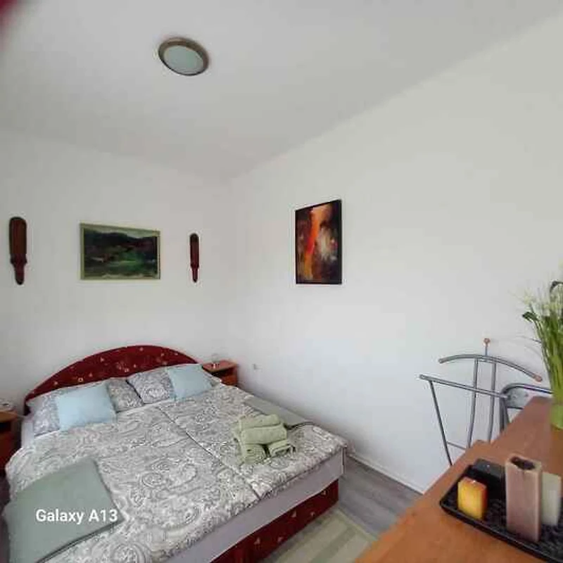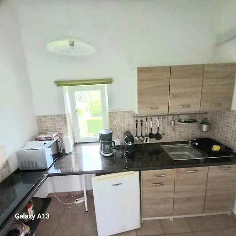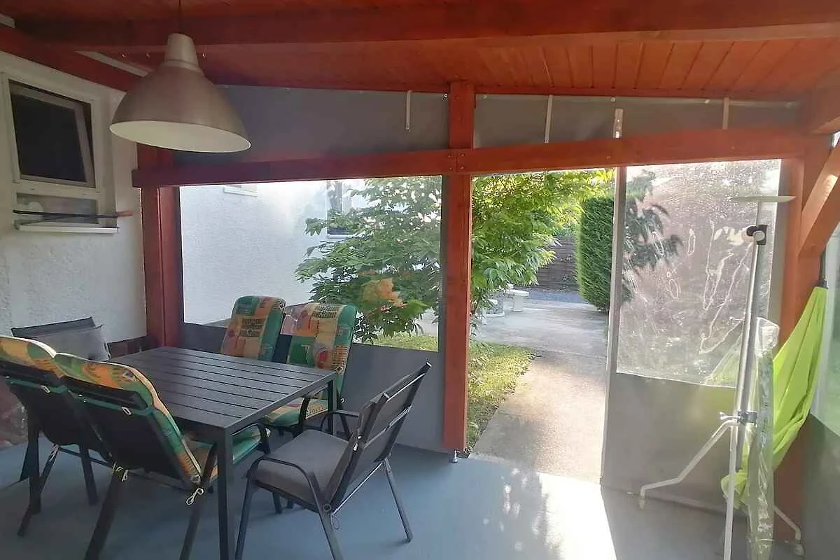 El apartamento vacacional está rodeada por un cerrado terreno de jardín o (400 m²) con prado, árboles, flores y arbustos. El terreno está rodeado de una valla y un seto. El propietario vive temporalmente en la casa o (con entrada privada). Esta casa tiene 2 apartamentos. Este apartamento tiene una entrada independiente en el primer piso y un jardín privado. Para uso privado a su disposición: césped, sombrilla, tumbona, muebles de jardín, columpio de jardín, barbacoa, zona de hogueras y patio. Piscina exterior para el uso común (diámetro 3,2 m, 1 m de profundidad). La instalación de la piscina esta operativa desde principios de junio hasta finales de agosto. Placa con agua fría y caliente. Parrilla para 6 personas.