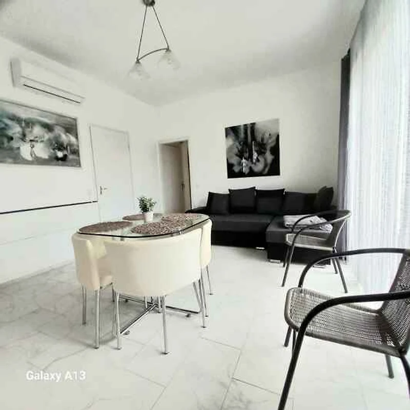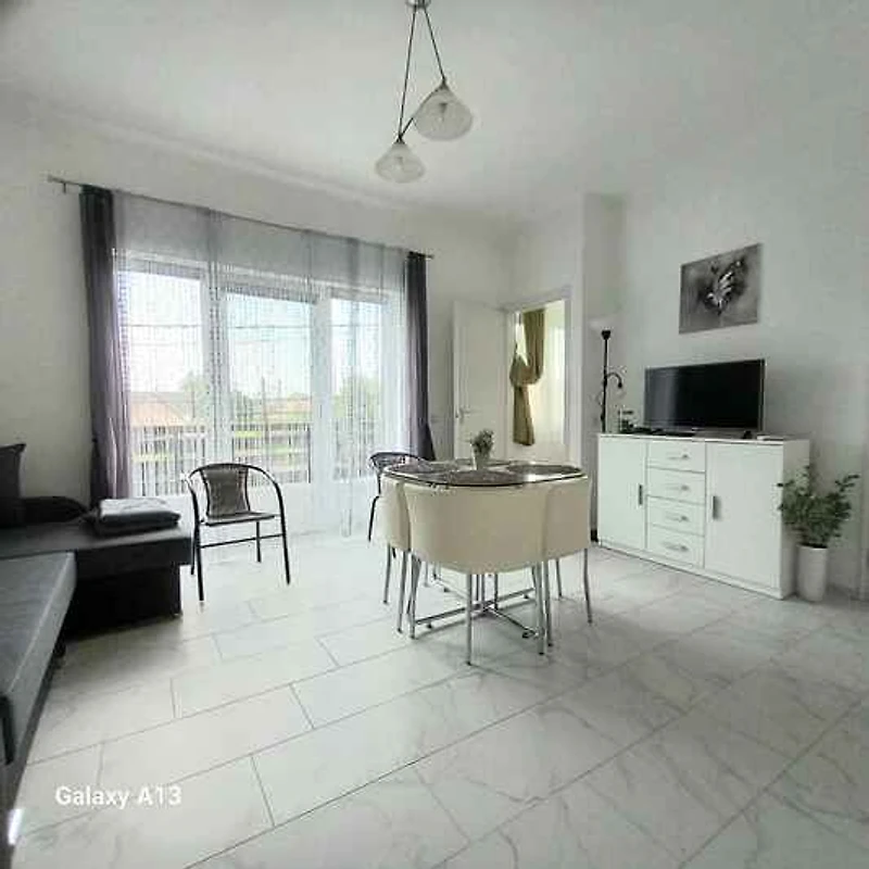 Su apartamento turístico: 1 planta, 4 habitaciones (de los cuales 3 dormitorios), 83 m², 7 personas. Aire acondicionado, calefacción eléctrica. Entrada por 1 escalón y una escalera exterior a la antesala con tresillo. Salón (16 m², habitación de tránsito) con 1 cama adicional en Sofá cama doble, rincón para sentarse, zona comedor (6 plazas), televisión, radio, DVD, CD y acceso al balcón acceso a la logia (muebles de jardín, 1 mesa, 6 sillas, 4 tumbonas, columpio de jardín, sombrilla). Dormitorio (10 m²) con 1 cama doble y 1 cama adicional en Sofá cama doble. 2 Dormitorio respectivamente (10 m²) con 1 cama doble. Cocina (6 m²) con cocina eléctrica (2 fuegos), horno, nevera (120 l., congelador), cafetera, tostadora y hervidor eléctrico de agua. Baño (sin calefacción) con ducha, 1 lavabo, inodoro y ventana. Baño con ducha, 1 lavabo, inodoro y ventana.