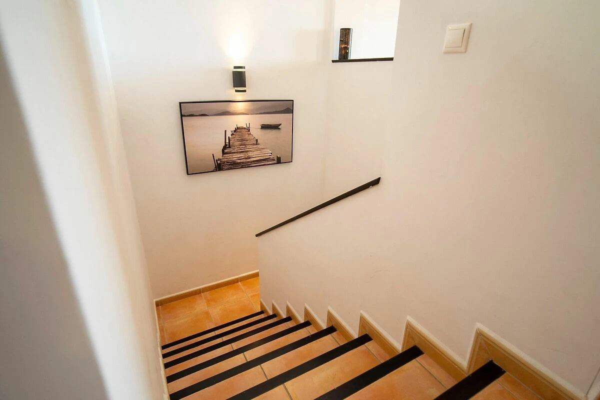 En la 1ª planta: (dormitorio(cama doble, balcón o terraza), dormitorio(2x cama individual, balcón o terraza), cuarto de baño(bañera con ducha, lavabo, váter, bidet), cuarto de baño(ducha, lavabo, váter, bidet), puertas de jardín, calefacción, tumbonas, tabla de planchar, plancha)