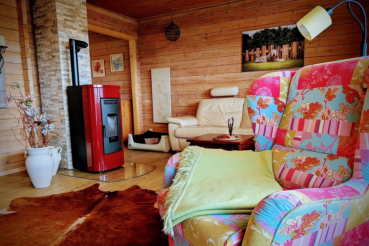 Sofá de cuero, televisor de pantalla plana, reproductor de DVD con DVD´s, wifi, radio DAB, varios juegos de mesa para niños y adultos, así como un rincón de lectura, estufa de pellets.