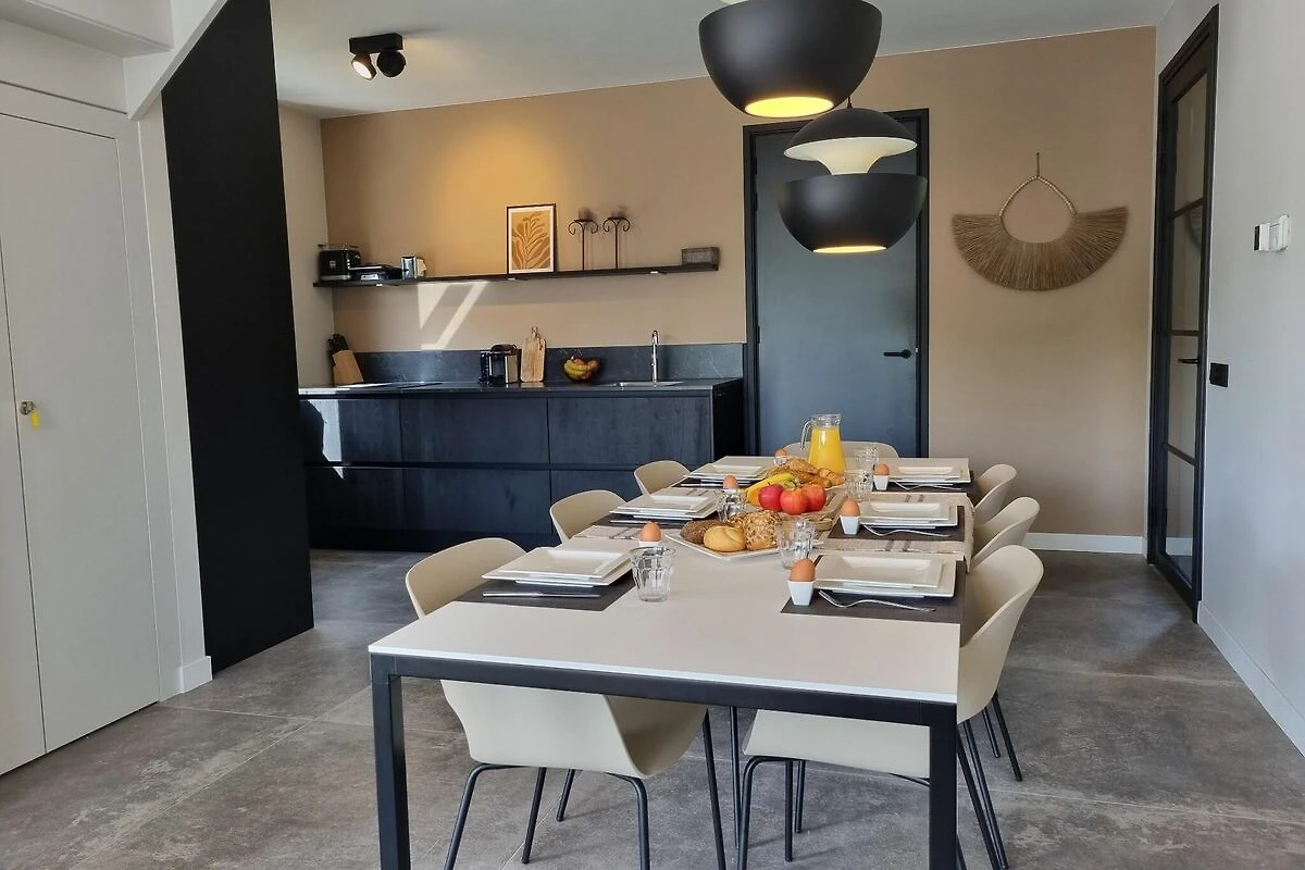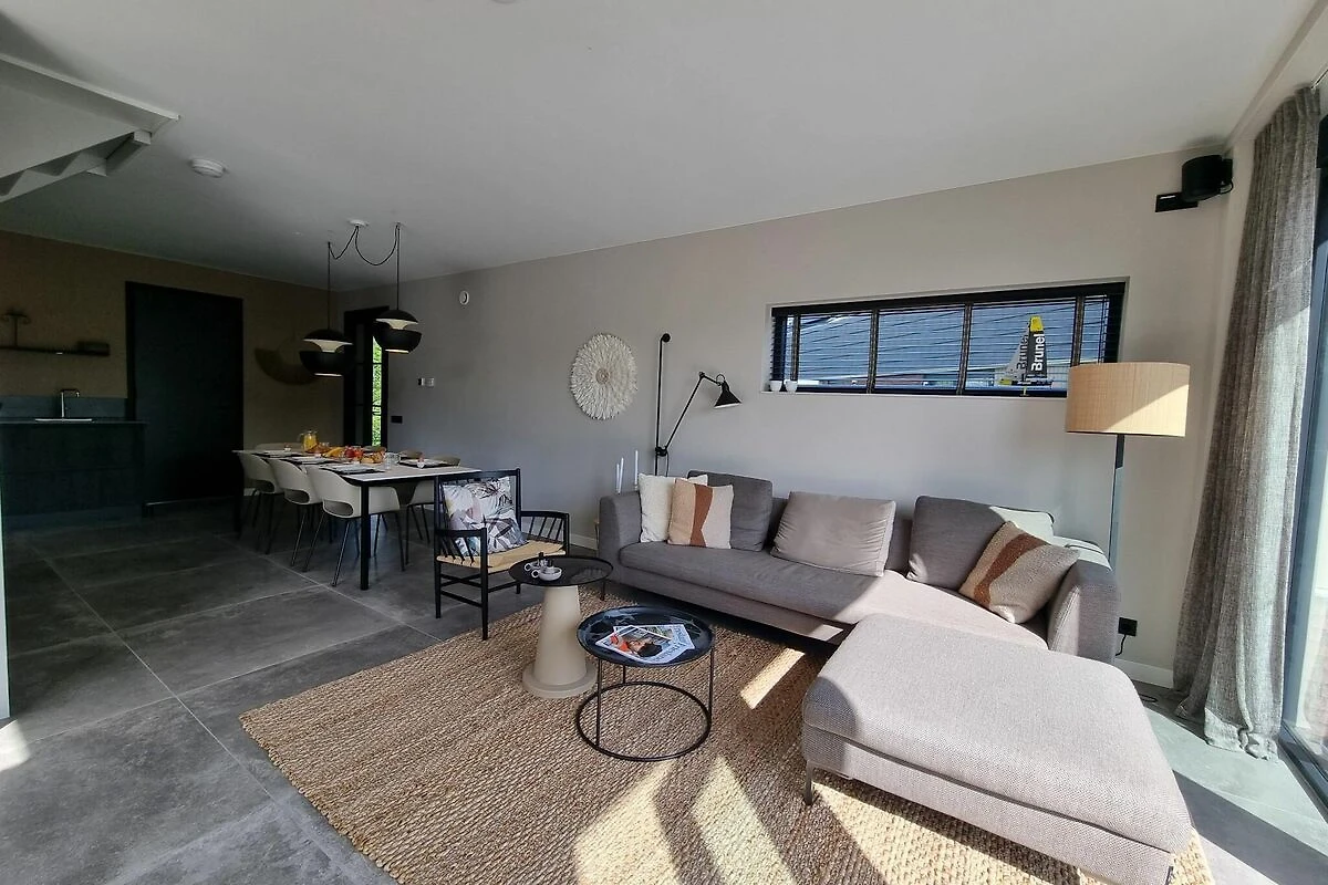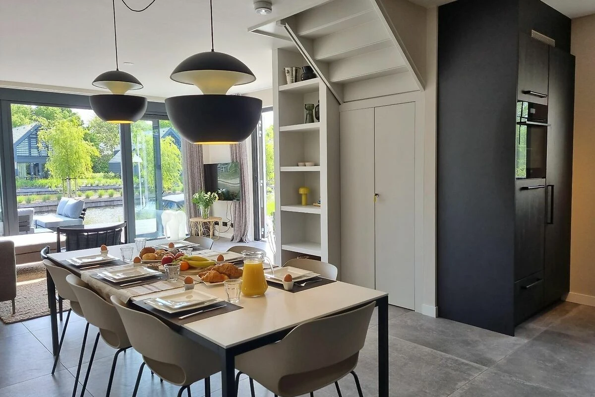 La cocina abierta forma parte del salón y está equipada con electrodomésticos de lujo. A través de las puertas francesas del salón se puede acceder fácilmente al jardín con una preciosa terraza sobre el agua.