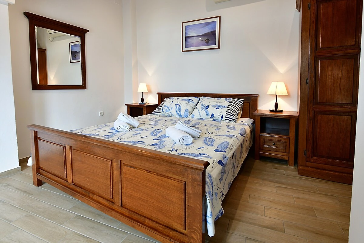 Su casa vacacional: 2 plantas, 3 habitaciones (de los cuales 2 dormitorios), 65 m², 6 personas. Aire acondicionado. Entrada por una escalera exterior a la cocina-comedor. 2 Dormitorio respectivamente con 1 cama doble y 1 cama adicional en sofá-cama. Salón con rincón para sentarse, televisión y acceso al balcón (3 m², muebles de jardín). Cocina en el salón con zona de comedor (6 plazas), cocina de gas, cocina eléctrica, horno, campana extractora de humos, lavavajillas, nevera, microonda y cafetera. Baño con ducha y inodoro.