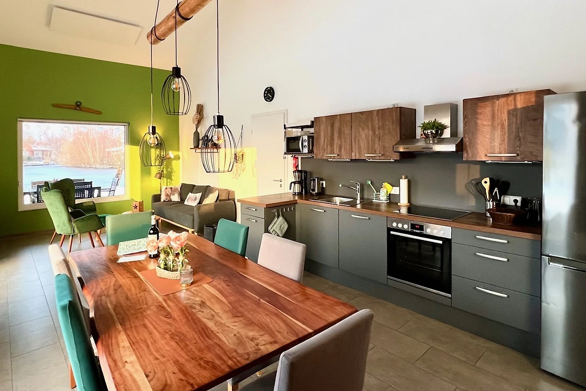 El salón-cocina es moderno y está amueblado con gusto. Dos personas más pueden dormir cómodamente en el sofá cama.