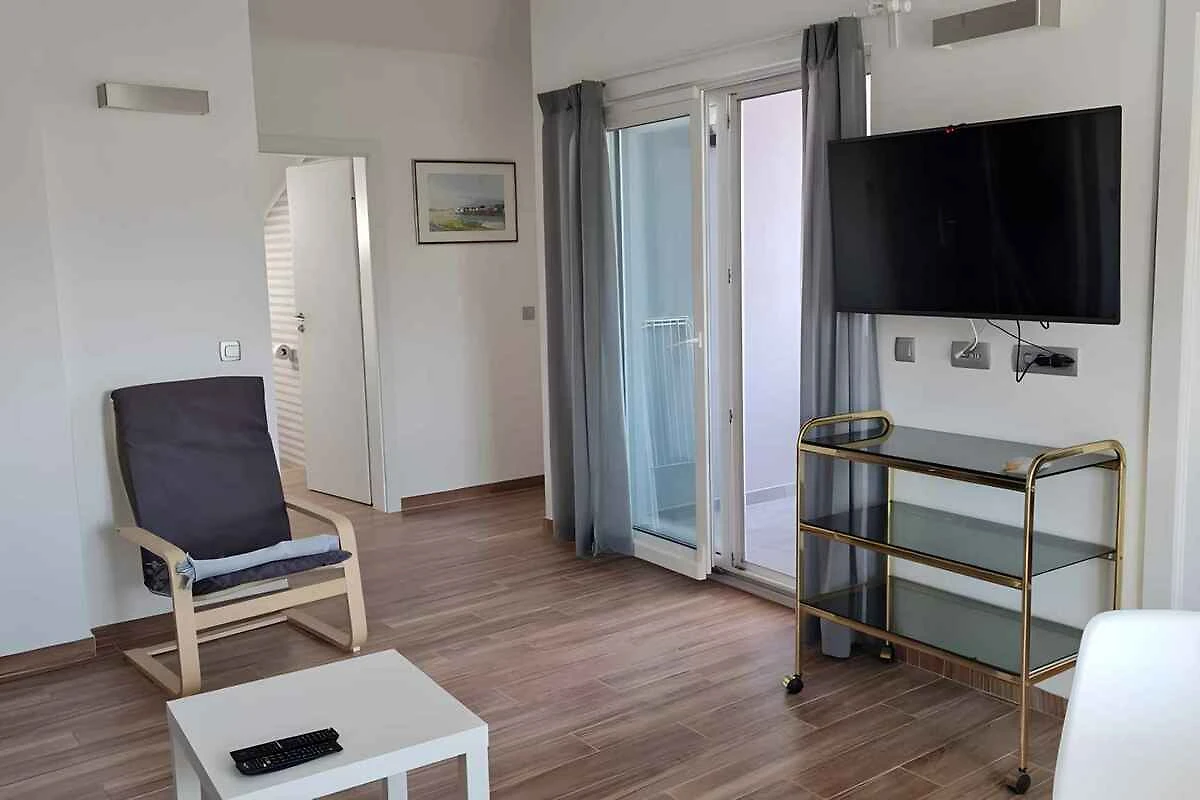 Su apartamento turístico: 1 planta, 3 habitaciones (de los cuales 2 dormitorios), 62 m², 4 personas. Aire acondicionado. 2 Dormitorio respectivamente con 1 cama doble y televisión. Salón/dormitorio con 1 cama adicional en sofá-cama, rincón para sentarse, zona comedor, televisión y acceso a la terraza. Cocina con zona comedor, cocina de inducción, lavavajillas, nevera (congelador), microonda, cafetera y hervidor eléctrico de agua. Baño con ducha, inodoro, secador de pelo y ventana. Wáter separado con inodoro.