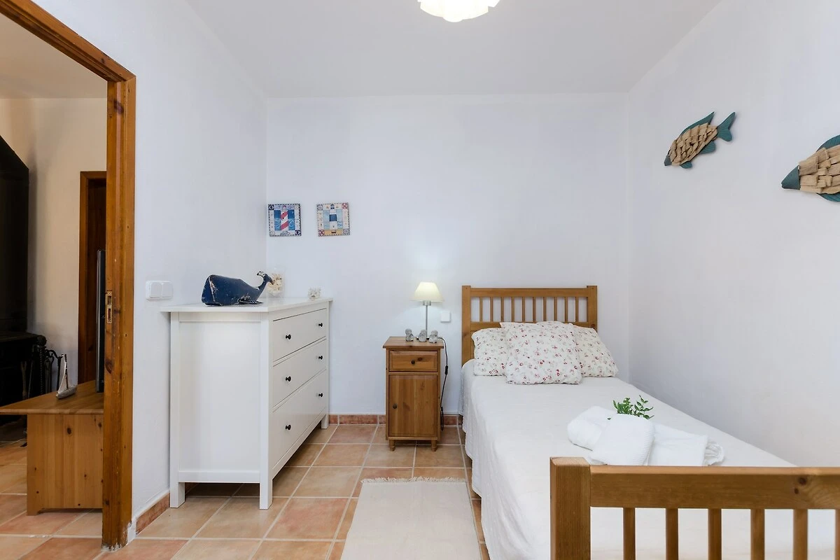 Dentro encuentran un cómodo salón, con aire acondicionado y TV satélite, abierto a la cocina-comedor, equipada con vitrocerámica y todo lo necesario para cocinar como en casa. La lavandería cuenta con lavadora, plancha y tabla de planchar. Hay dos habitaciones con armario, una con cama doble y A/C y otra con una cama individual, así como un baño con ducha. Pueden ejercitarse en las máquinas del coqueto gimnasio dentro del cual también tienen un baño con ducha. Una cuna, una trona y 2 ventiladores están disponibles.