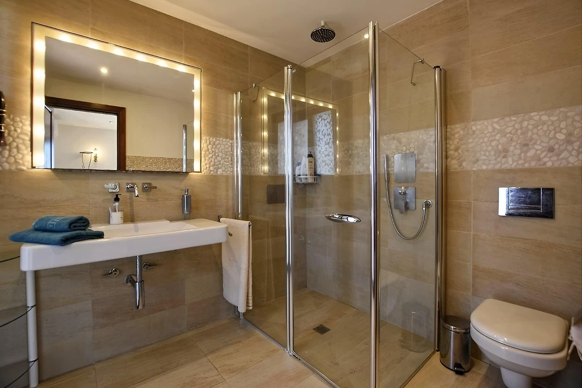 La segunda planta está dedicada a un sueño reparador y a la privacidad, con tres dormitorios bien equipados, cada uno con su propio baño en suite con ducha, lavabo, inodoro y bidé. Dos dormitorios ofrecen cómodas camas dobles, mientras que el tercero tiene dos camas individuales, lo que lo hace versátil para familias o amigos. Cada dormitorio está equipado con aire acondicionado para una comodidad máxima, y uno incluso cuenta con un balcón o terraza privados, perfectos para disfrutar de la brisa mallorquina.