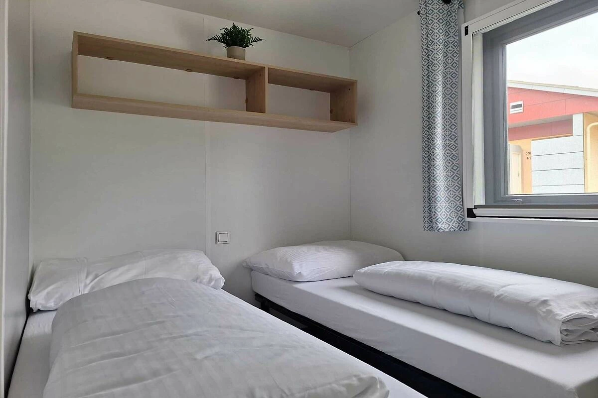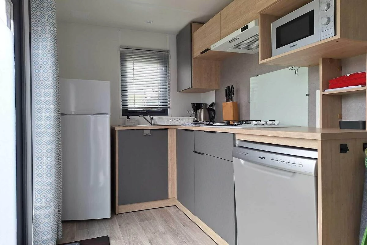 En su interior, la casa móvil puede alojar cómodamente hasta 4 huéspedes con prácticos espacios que incluyen una luminosa sala de estar de planta abierta, una pequeña cocina equipada para cocinar a diario y un acogedor comedor. La distribución incluye dos dormitorios con una cama doble y dos camas individuales para garantizar noches de descanso reparador, y su distribución facilita tanto el tiempo libre como la comodidad personal. El interior se complementa con modernas comodidades que hacen que las estancias con cocina sean sencillas y agradables.