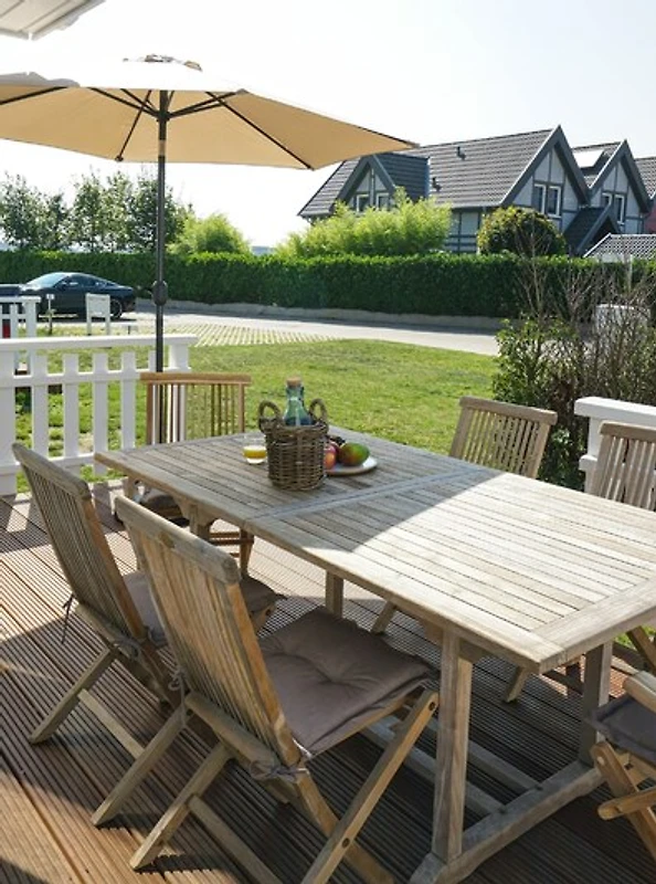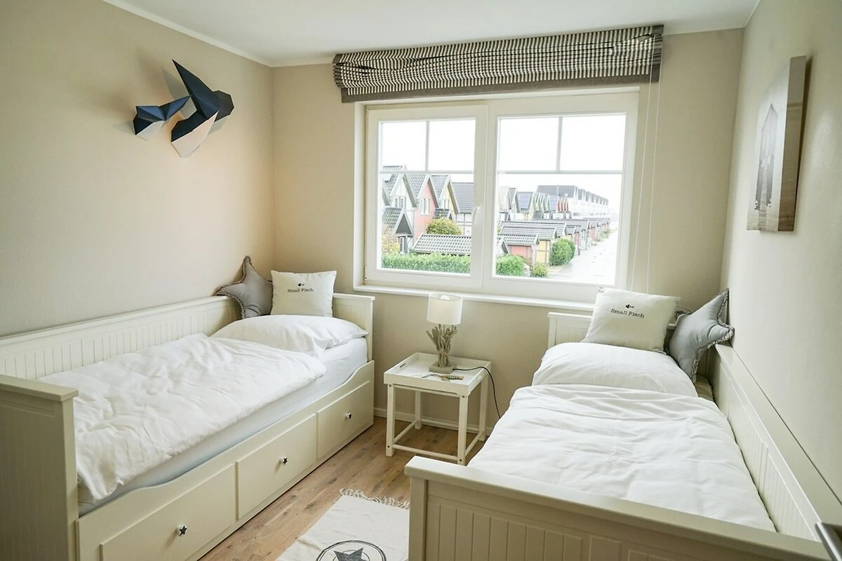 El salón está equipado con un acogedor sofá y una cocina abierta contigua, donde se pueden preparar deliciosas comidas y degustarlas en la gran mesa de comedor. Desde el salón, tiene acceso directo a la terraza de la planta baja, orientada al oeste: termine sus ajetreados días de vacaciones con una copa de vino y disfrute de las Desde la terraza de la azotea, tiene una gran vista del puerto de la localidad del Mar Báltico y del Schlei y puede disfrutar de hermosas puestas de sol