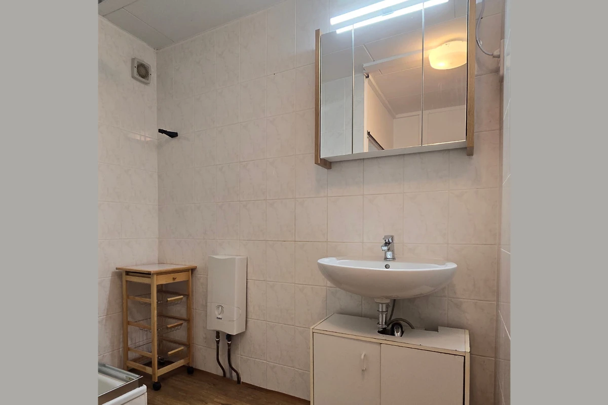 A la izquierda del salón-dormitorio se encuentra el cuarto de baño con ducha, WC (separado) y lavabo.